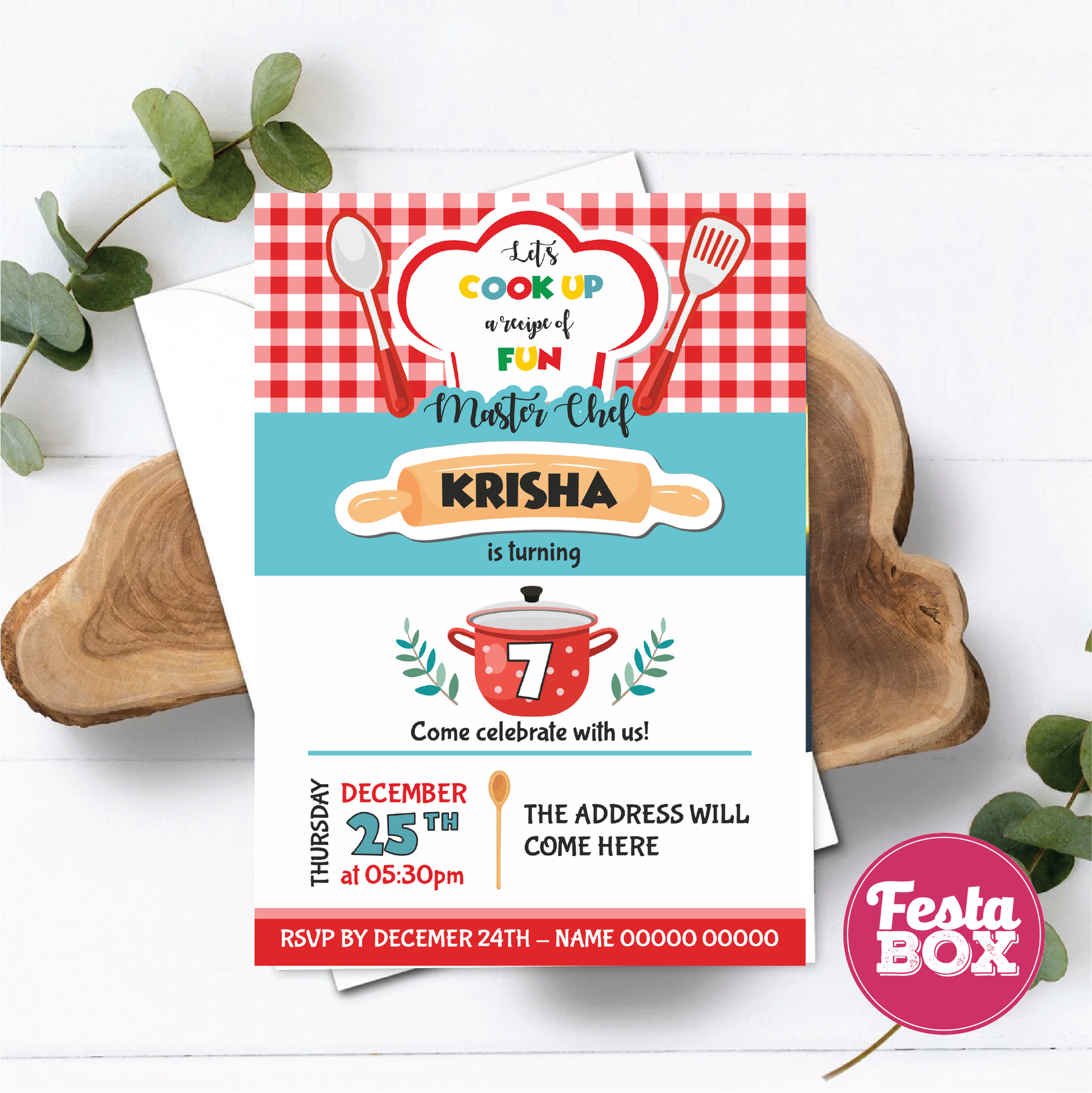 Celebrate your child's special day with our Birthday Party Invitation - Chef Theme! With Festabox's Chef Theme design, this set of 6 or 12 invitations is perfect for any little chef's first birthday or for boys and girls of all ages. Order now and get ready for a deliciously fun party!