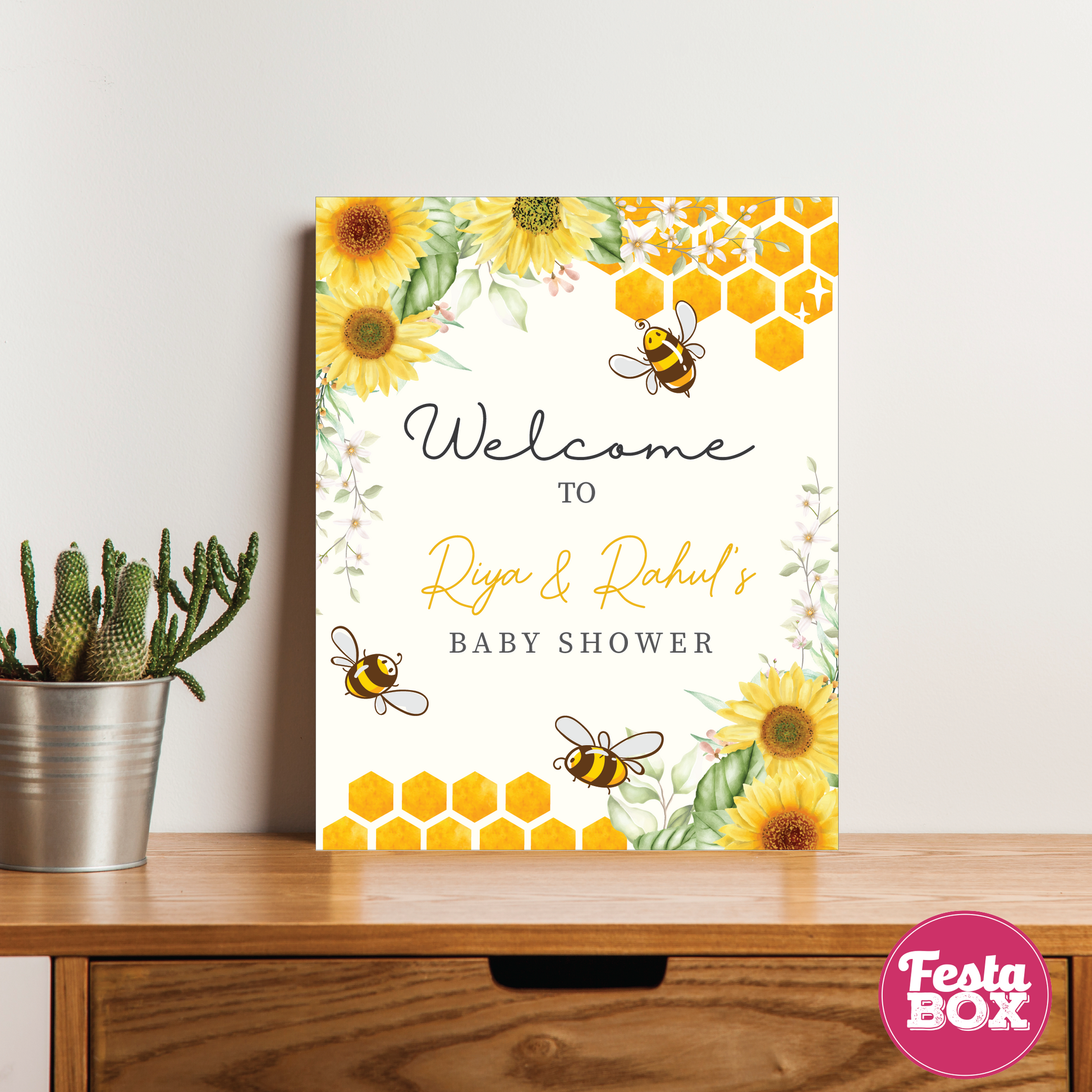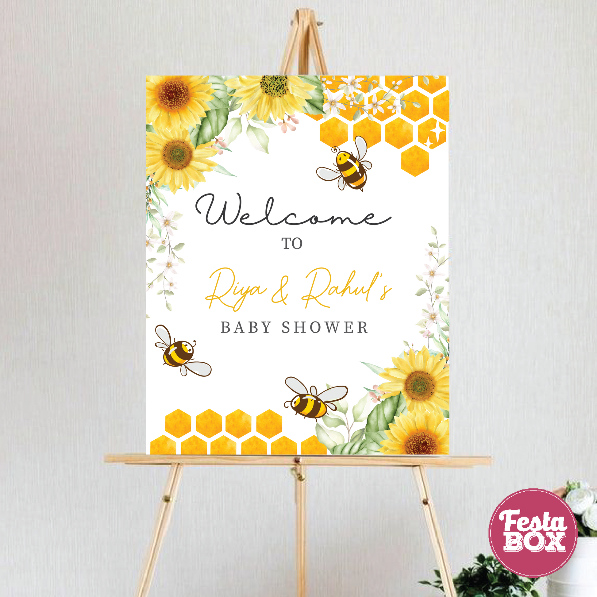 Welcome your guests with this charming Honeybee Collection Welcome Sign by Festabox! Perfect for baby showers, seemantham, and valaikappu, this sign beautifully ties in with the rest of the collection and sets the tone for a sweet and memorable celebration. Add a touch of buzz-worthy charm to your event!